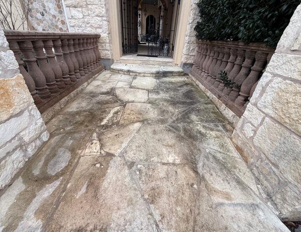 Algae growth on limestone is extremely common in Texas, especially around entrance areas where moisture, shade, and limited airflow create the perfect environment for organic buildup. Limestone is a very porous stone, meaning it absorbs moisture and allows algae to anchor deep into the surface. Over time this leads to dark green or black streaking, discoloration, and a dull, dirty appearance that stands out—especially at the front entrance of a home.