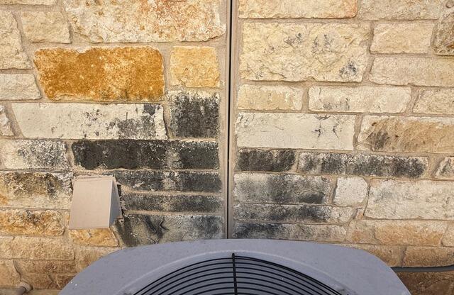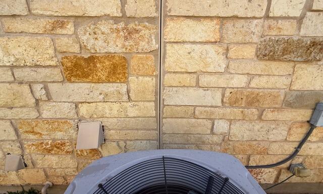 Algae growth behind AC units is extremely common in Texas. The constant moisture produced by the condenser, combined with the limited air flow and the unit’s close placement to your home’s exterior wall, creates the perfect environment for algae to thrive. This issue is especially noticeable on limestone surfaces, which are highly porous and allow algae to anchor deeply and spread rapidly.