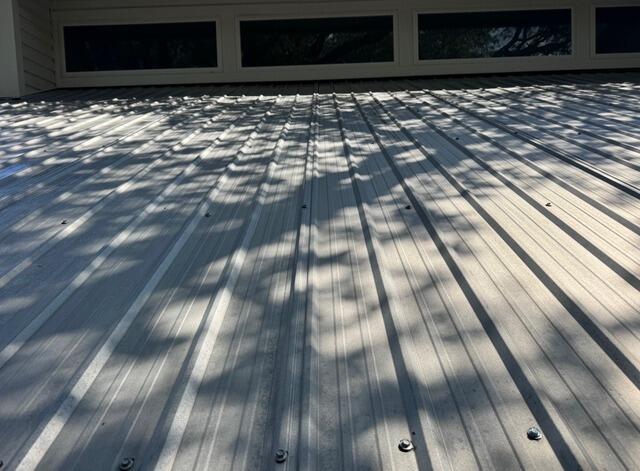 Metal roofs, especially in shaded areas or under trees is the perfect environment for algae and moss growth. Typically it will darken your surface and give a black look to your roof. Using our proprietary solutions, gentle hand brushing and technical application we are able to safely clean your metal roof. Leaving you with a very clean bright roof.